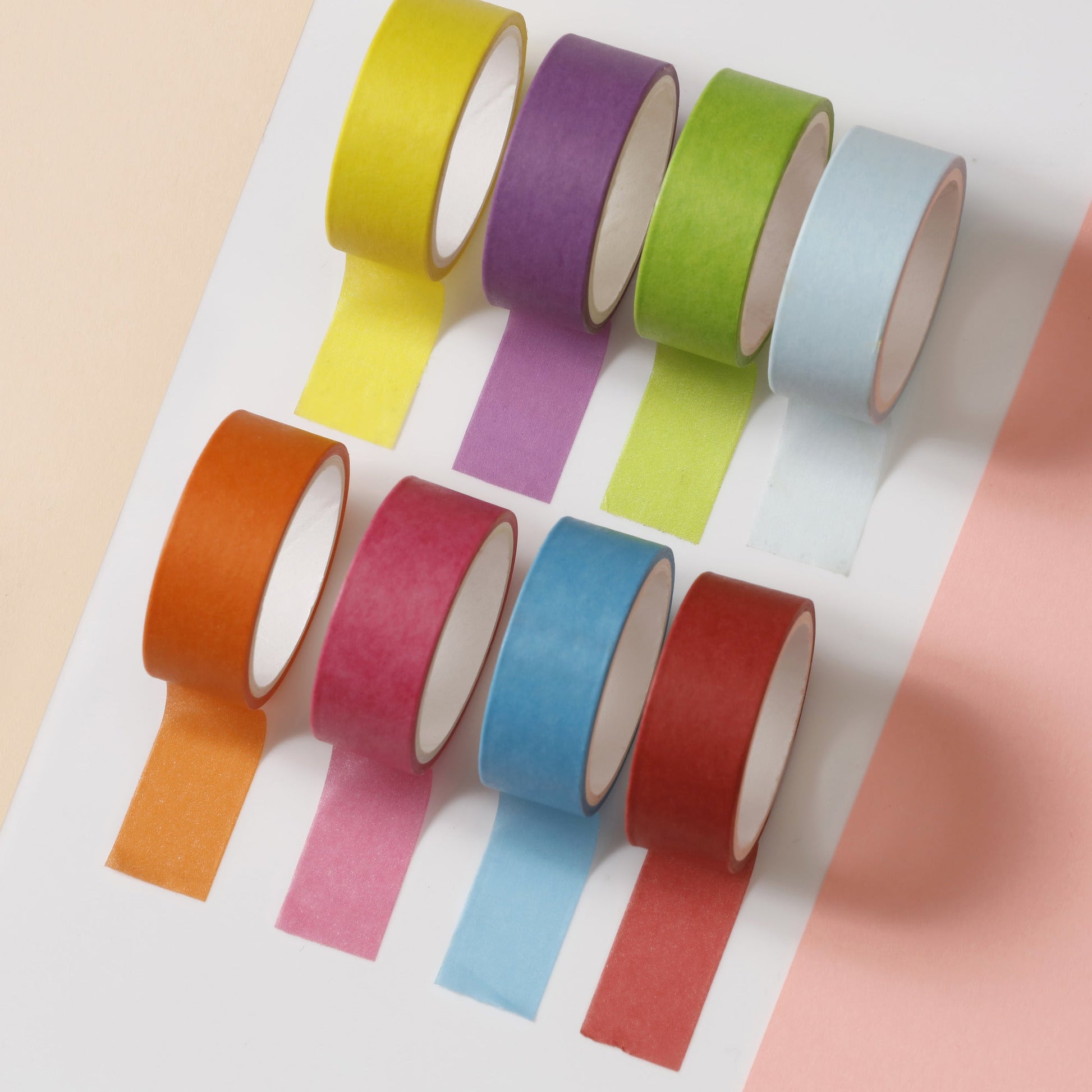 - Each masking tape colored set includes 8 rolls (1 roll each color) (Yellow, Green, Blue, Orange, Red & More). Each roll is 10 ft long and 1/2 inch wide. Experience effortless and mess-free crafting at home, work, or school. Our craft tape adheres securely and peels off cleanly, thanks to its natural rubber adhesive—making it the perfect choice for your creative projects.