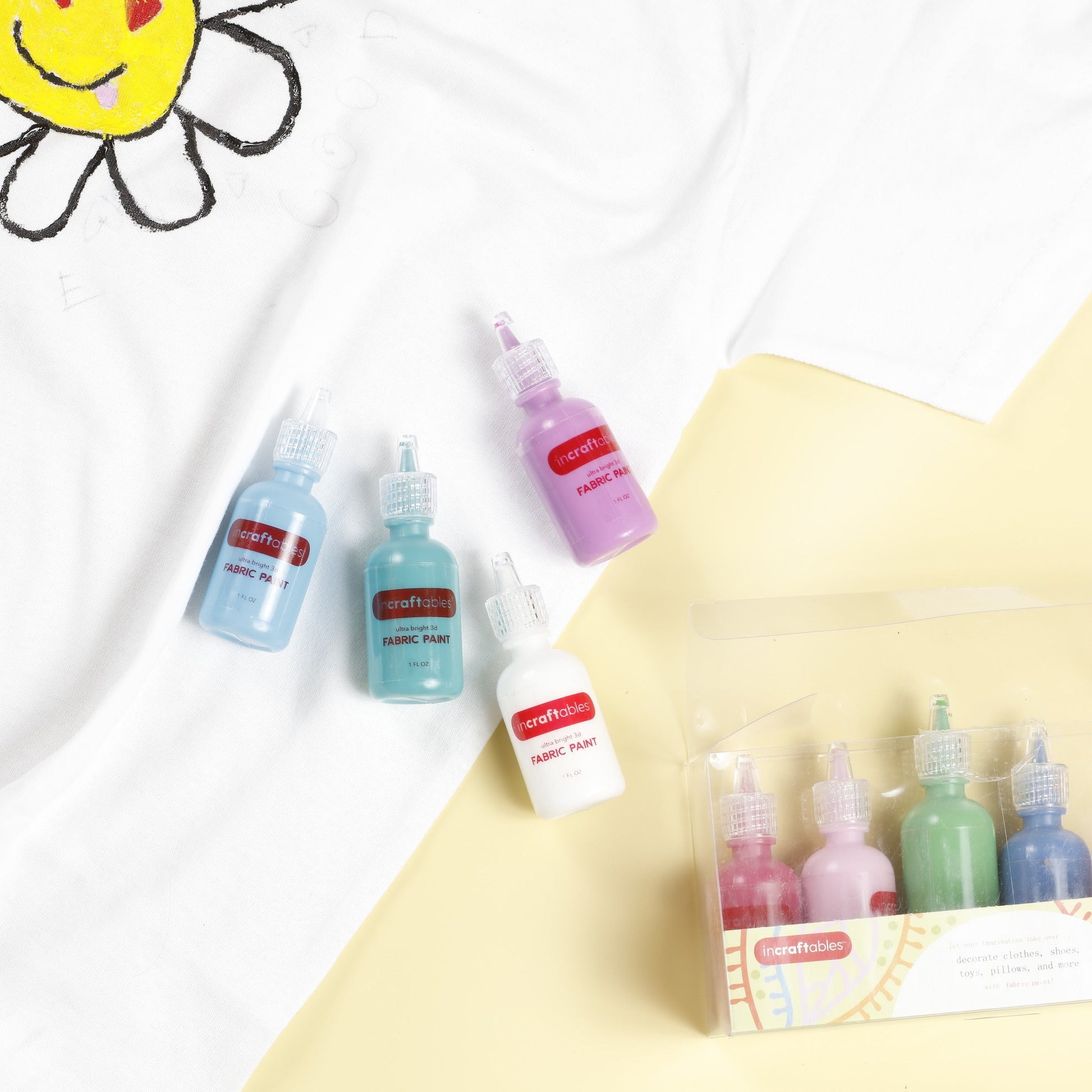 - Incraftables fabric paint set include 12 assorted colors (black, white, green, red, pink, blue, aqua, purple, orange and more) fabric paints 1 oz each color. Unique technology long lasting colors, suitable for most art and art techniques. The rich texture and abundant pigments, combined with carefully crafted rheology and viscosity, guarantee effortless blending and effortless application, providing excellent coverage for expansive surfaces and intricate elements. This textile paint swiftly dries, retaining its vibrancy post-curing.