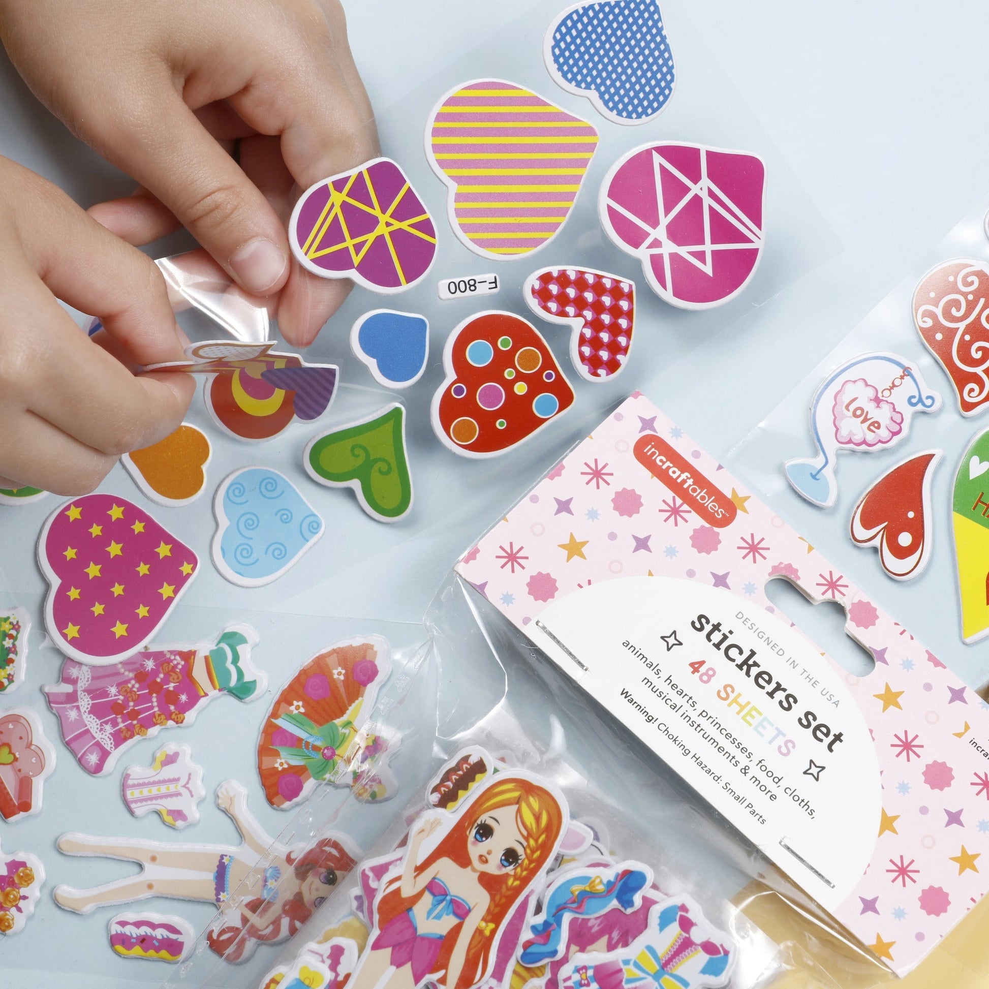 - Each reusable puffy stickers set includes 48 sheets of cute puffy stickers including hearts, animals, princesses, cloths, food, emojis, musical instruments & more.