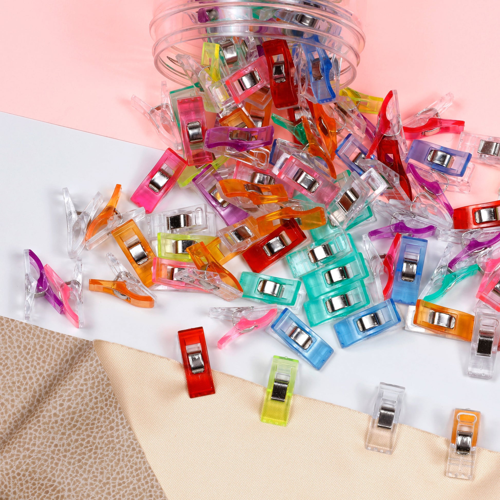 Each set includes 100 sewing clips in 9 vibrant colors. Each clip measures 1.06 inches x 0.16 inches x 0.35 inches, offering a compact and convenient size for various uses. The clips are made from high-quality material to ensure durability and a smooth finish.How Do You Use Sewing Clips in Your Projects?